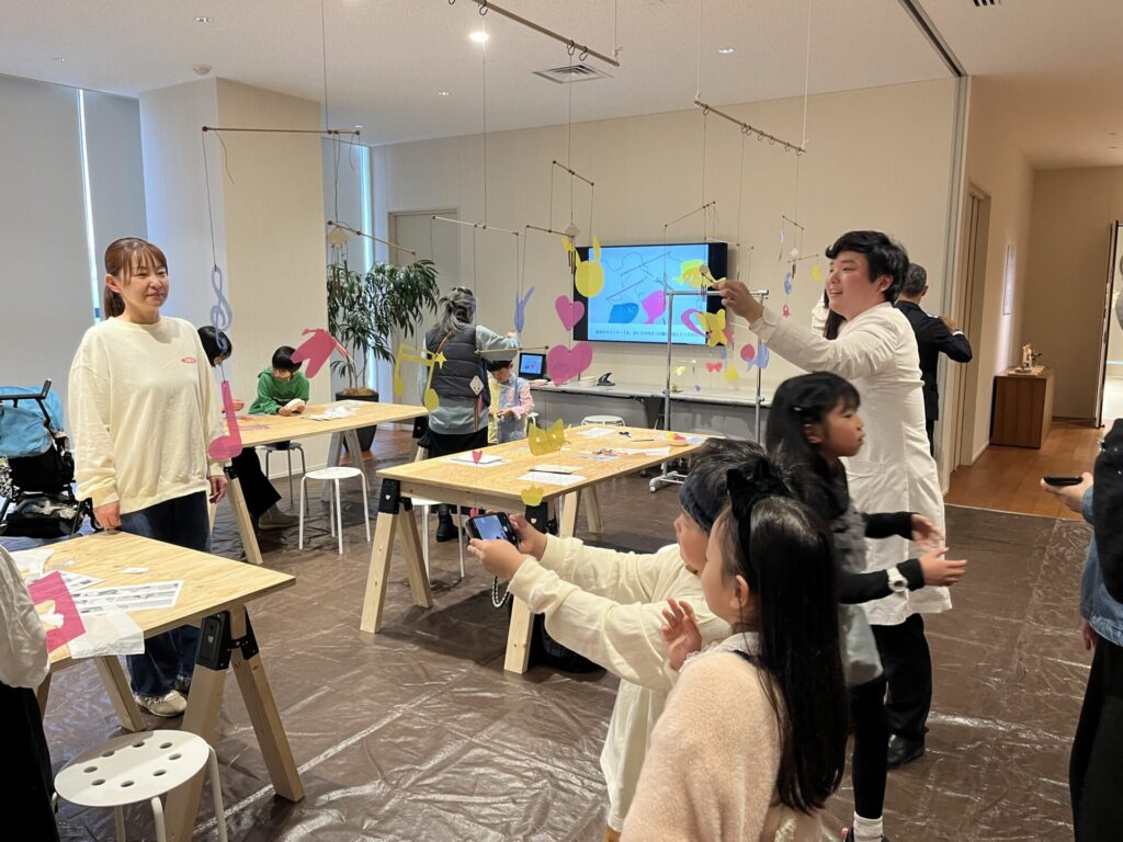 「モビール作りワークショップ」では蝶や魚・好きなキャラクターなど、様々な形に切り取ったパーツを組み合わせ、個性が光るモビールを作成されていました。完成した作品が飾られた会場内は、爽やかなウィンドチャイムの音が響き、春らしい明るく華やかな雰囲気に包まれました。