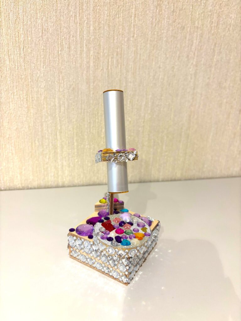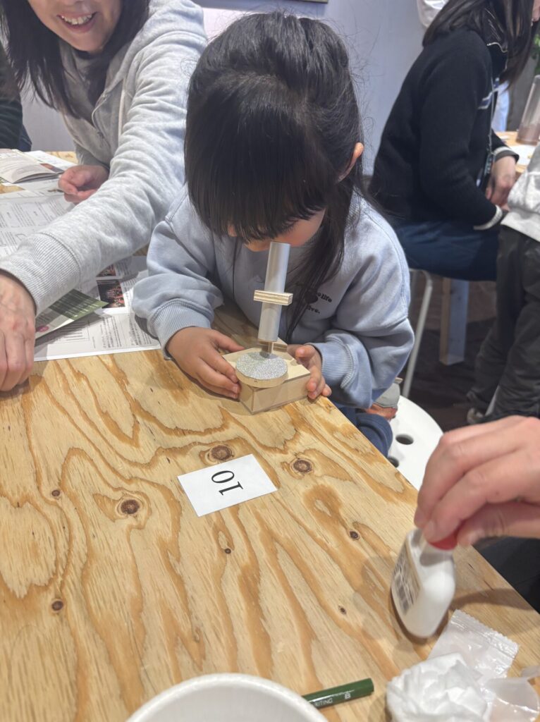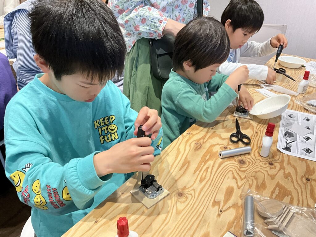 「万華鏡オルゴール作り」では、お子様から大人の方まで幅広い世代の方々にご参加いただきました。筒の先にある円盤をデコレーションすると、オルゴールの音色にあわせて回転し、キラキラした世界が筒の中いっぱいに広がります。完成した万華鏡を覗き込みながら、自分だけの光と音の世界を楽しんでおられました。